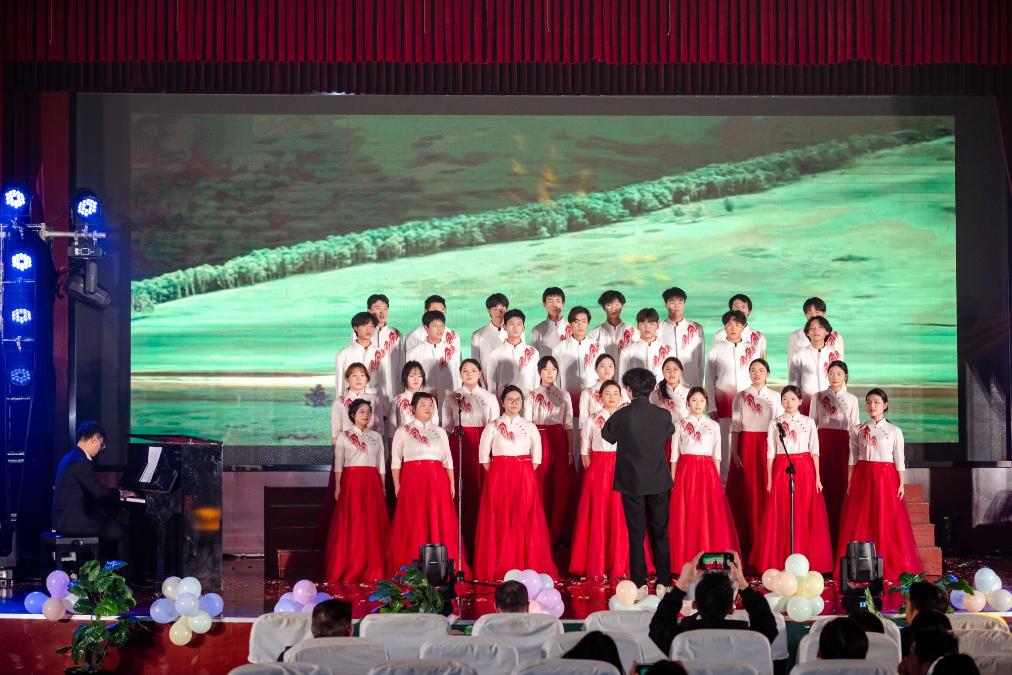 话剧《觉醒年代》选段慷慨激昂,唤起全场师生的家国情怀;乐队伴唱《乌兰巴托的夜》辽阔深情,令人沉醉;爵士舞串烧活力迸射,彰显青春的多元与张力;压轴联唱《家乡》《上春山》,将深沉的家国情怀与明媚的春光向往融为一体,荡气回肠。十五个节目轮番登场,精彩纷呈,既有传统艺术的厚重,亦有时代潮流的脉动,展现了各学院、学生社团蓬勃的文化创造力与团结向上的精神风貌。