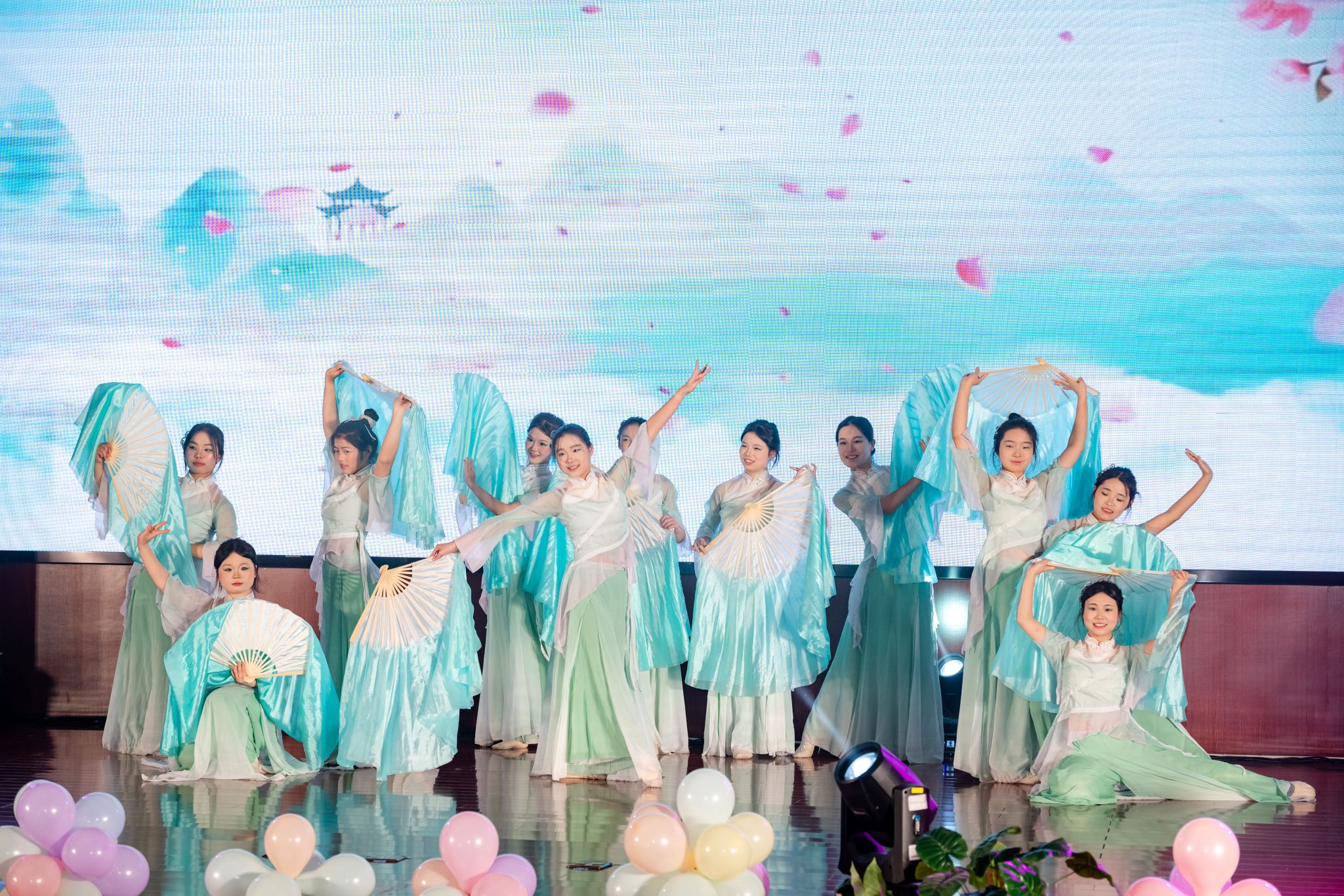 开场舞《我的对》以饱满的节奏、灵动的舞姿,瞬间点燃全场热烈气氛;歌伴舞《世界赠予我的》温情流淌,传递出对生活的热爱与感恩;扇子舞《折柳》韵味悠长,尽显传统艺术的典雅之美;一曲《像风一样》唱出青春的自由与对未来的向往;情景剧《诚心橙意 公益助农》将专业精神与社会担当巧妙结合,朴实动人;古典舞《莲鼓越歌行》翩若惊鸿,引人入胜。